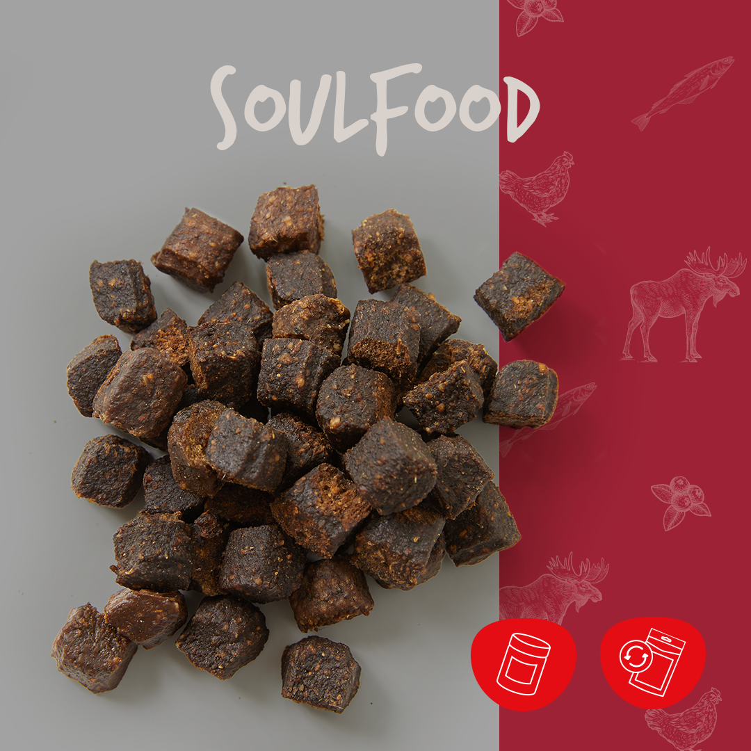 cadocare dog treats, give your dog a piece of love! Our SOULFOOD is the little energy boost for in between and balm for the dog's soul. SOULFOOD snacks are gently air-dried meat snacks that have been adapted to the natural diet of the wolf by adding herbs, vegetables and/or berries. With this plus in taste, appearance and appealing smell, they are suitable for dogs of all ages and breeds and even convince mistresses and masters.